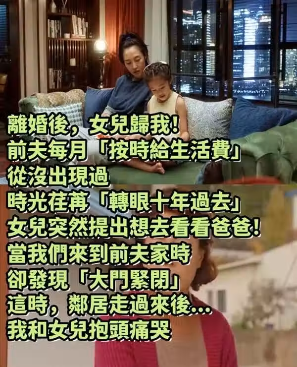 失婚後,女兒歸我!前夫每月都「按時給生活費」從沒出現過 時光荏苒「轉眼十年過去」女兒突然提出想去看看爸爸!當我們來到前夫家時,卻發現「大門緊閉」這時,鄰居走過來後...我和女兒抱頭痛哭