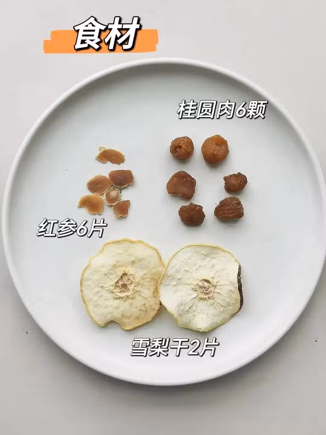 紅參6片(這裡紅參比較小片,用了6片,紅參大片的用3片就可以),桂圓肉6顆,雪梨乾2片(也可以買新鮮的雪梨)