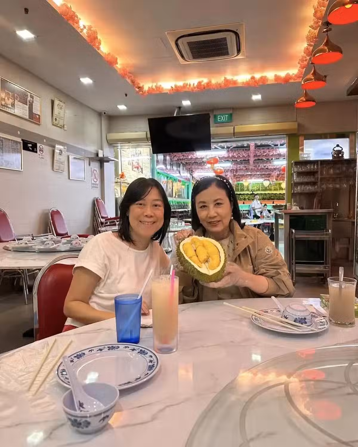 78歲汪明荃在新加坡,和親友聚餐,還去吃了榴槤,晚年生活好快樂
