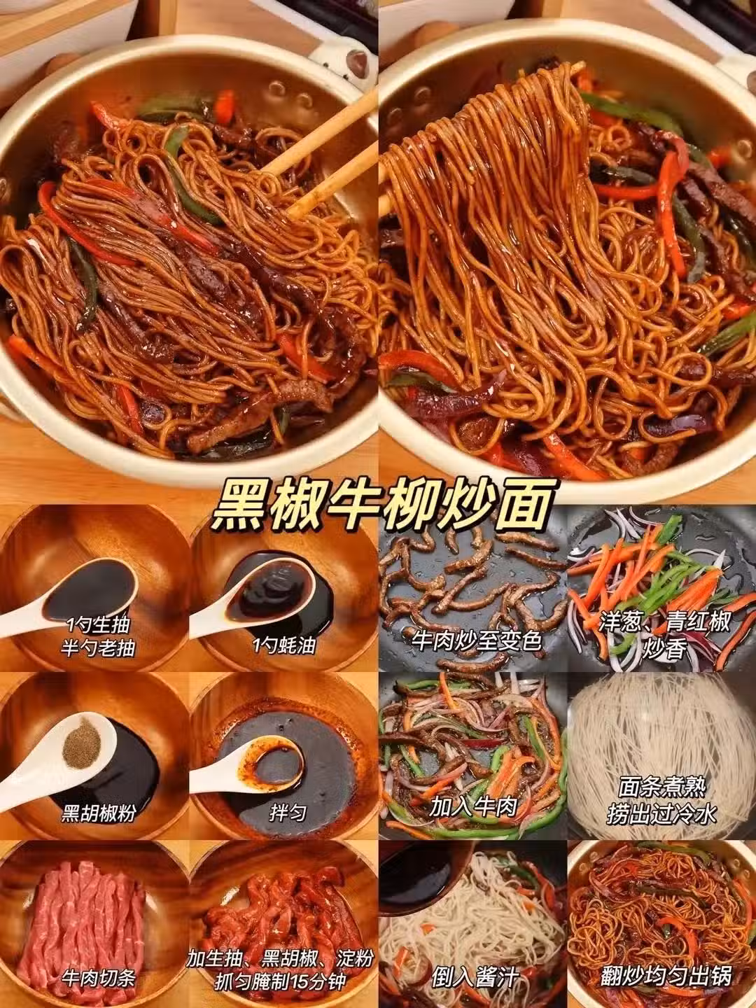 大排檔鑊氣複製指南。牛肉條黑胡椒腌10分鐘爆炒,加入煮熟的方便麵和青椒,顛勺時記得甩出火星子(安全第一!)。