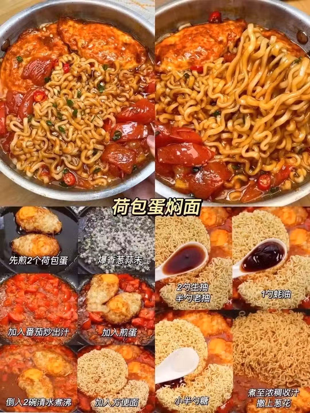 社畜の五分鐘續命丹。煎個流心蛋丟進煮麵鍋,生抽老抽蚝油各一勺,燜到麵條吸飽醬汁,筷子一挑蛋黃瀑布直接淹沒碳水火山。