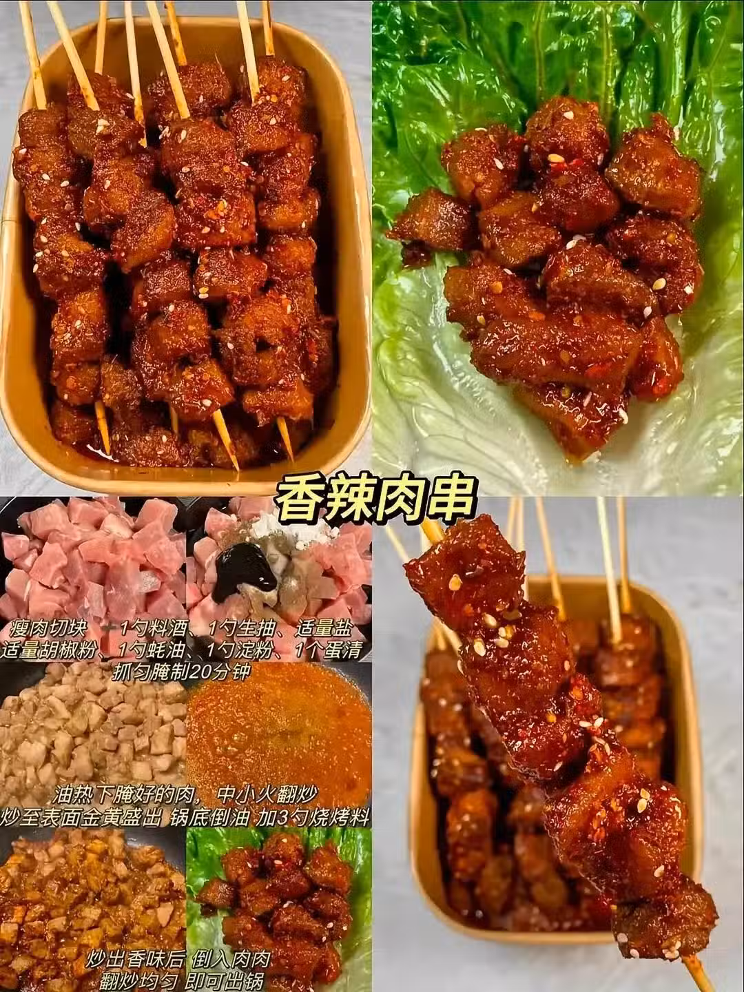 香辣豬肉串:新疆夜市平替方案,豬瘦肉切骰子塊,生抽+孜然+胡椒粉+蛋清腌20分鐘。 油熱下腌好的肉中小火翻炒,滋滋冒油時記得關窗,不然整棟樓的餓狼都要來敲門。