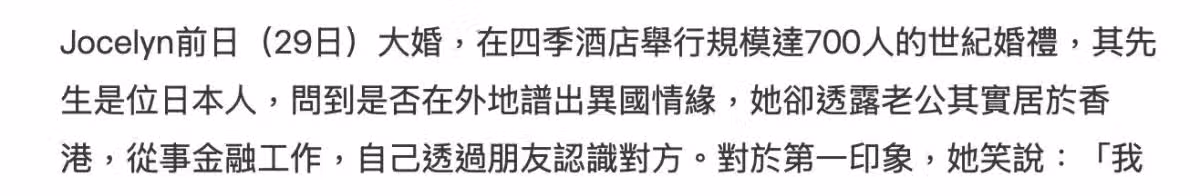 不過蔡頌思的丈夫就並非豪門子弟,是在香港從事金融工作的日本人。蔡頌思透露是通過朋友認識對方,第一次見到對方就有了好感,兩人日常都是以英文交流。