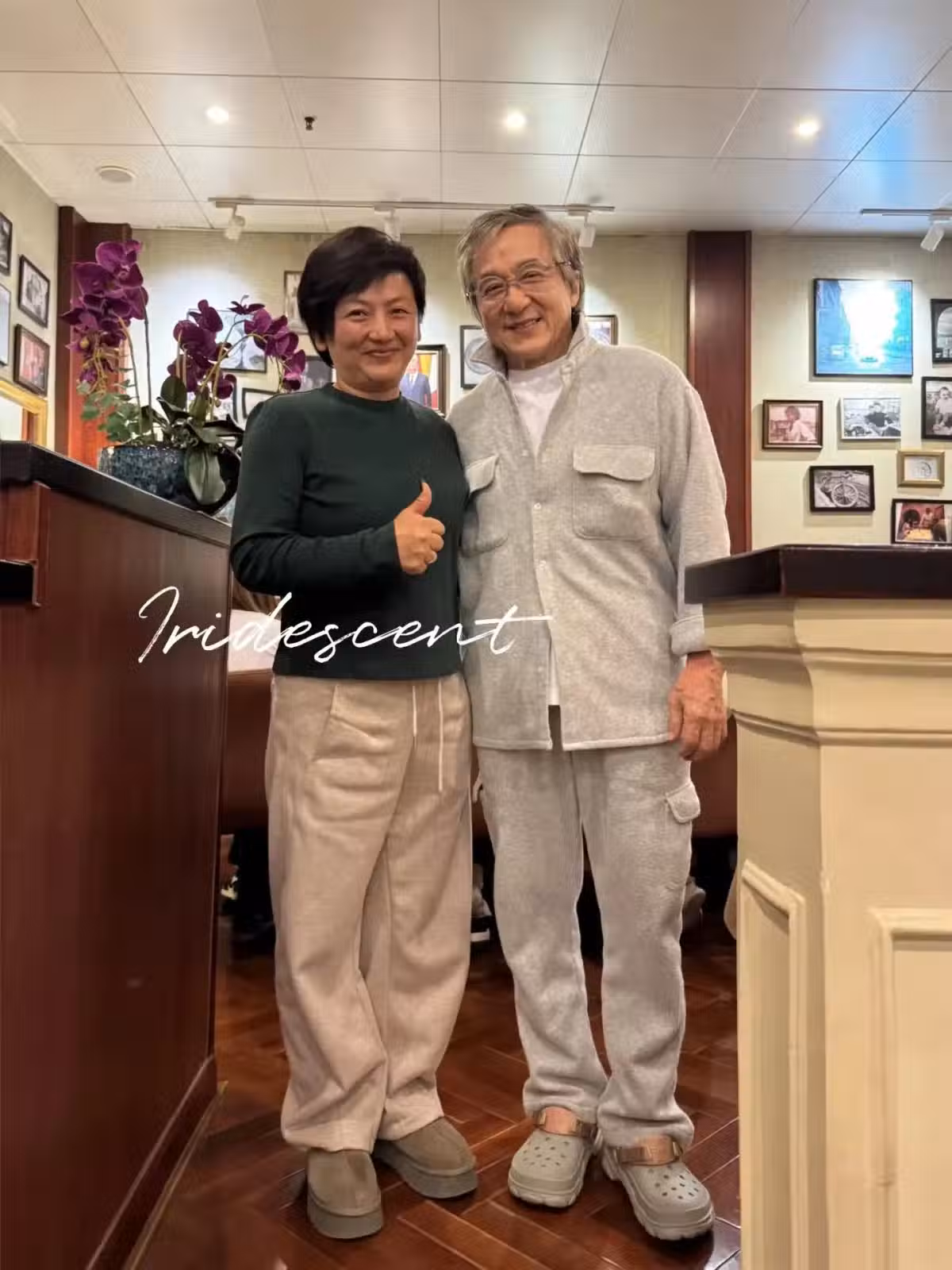 照片中,成龍穿著低調,一身素衣,腳上穿著洞洞鞋,這身穿搭,讓他看起來和普通老人一樣,完全不像國際巨星。