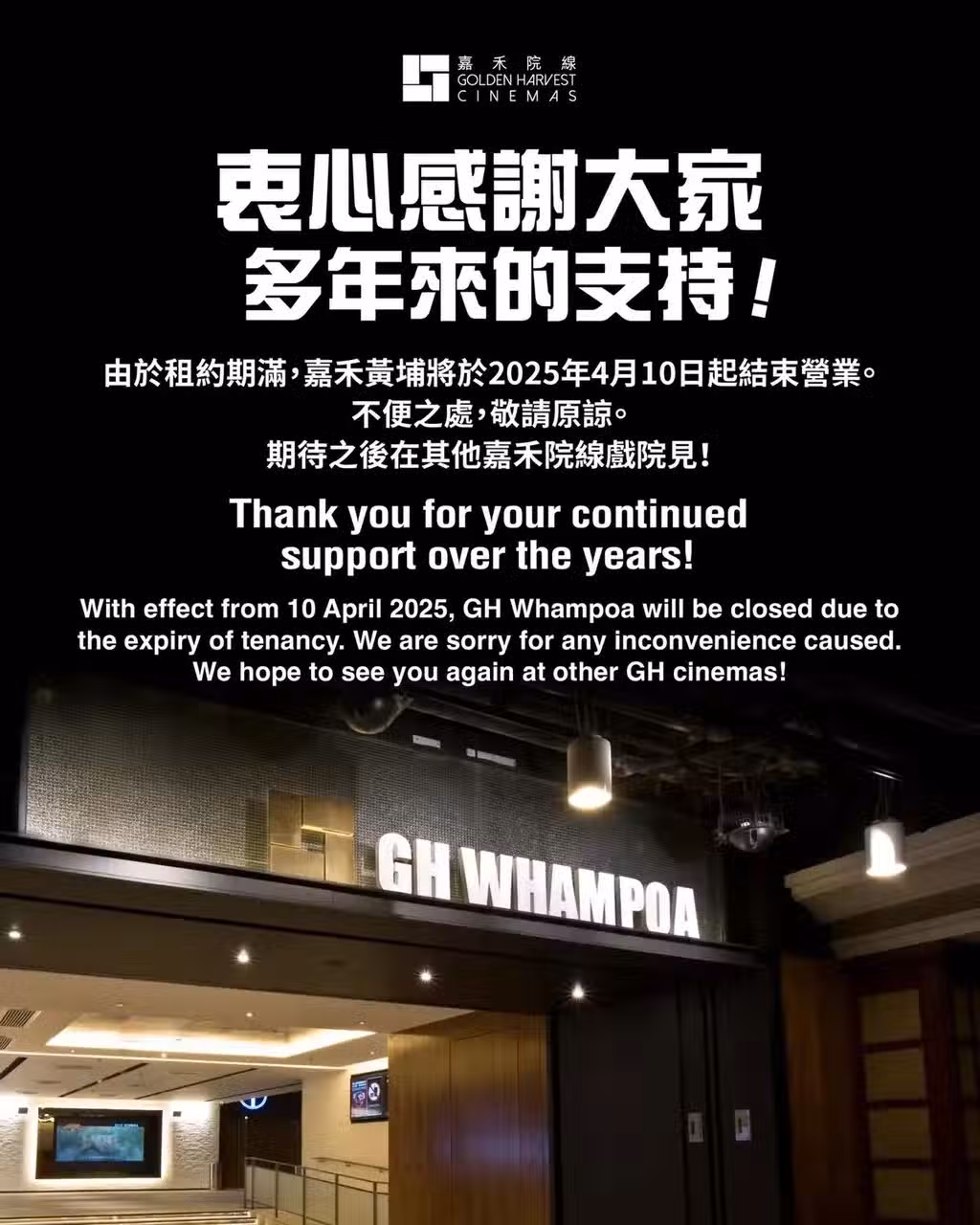 ▲ 嘉禾院線在社交平台發文宣布嘉禾黃埔結業消息。(Facebook「嘉禾院線」專頁圖片)