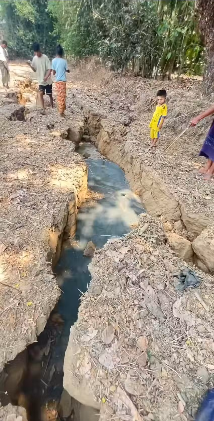 震後,緬甸的一些偏遠部落地區出現了令人不安的自然現象——裂縫中冒出的黑白相間的黏稠物質,當地人們稱之為「地漿」。