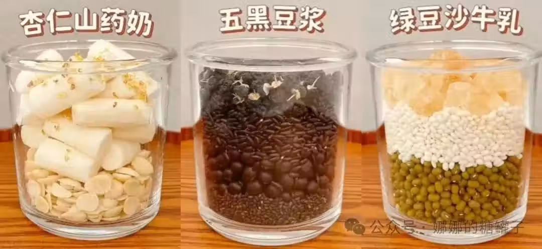 10.杏仁山藥奶:山藥100克、杏仁20克、桂花。食材洗凈加500毫升水按米糊模式,打完加100毫升奶。 11.五黑豆漿:黑芝麻10克、黑豆20克、黑米20克、桑葚干10幾顆、黑枸杞。食材洗凈加500毫升水按豆漿模式。