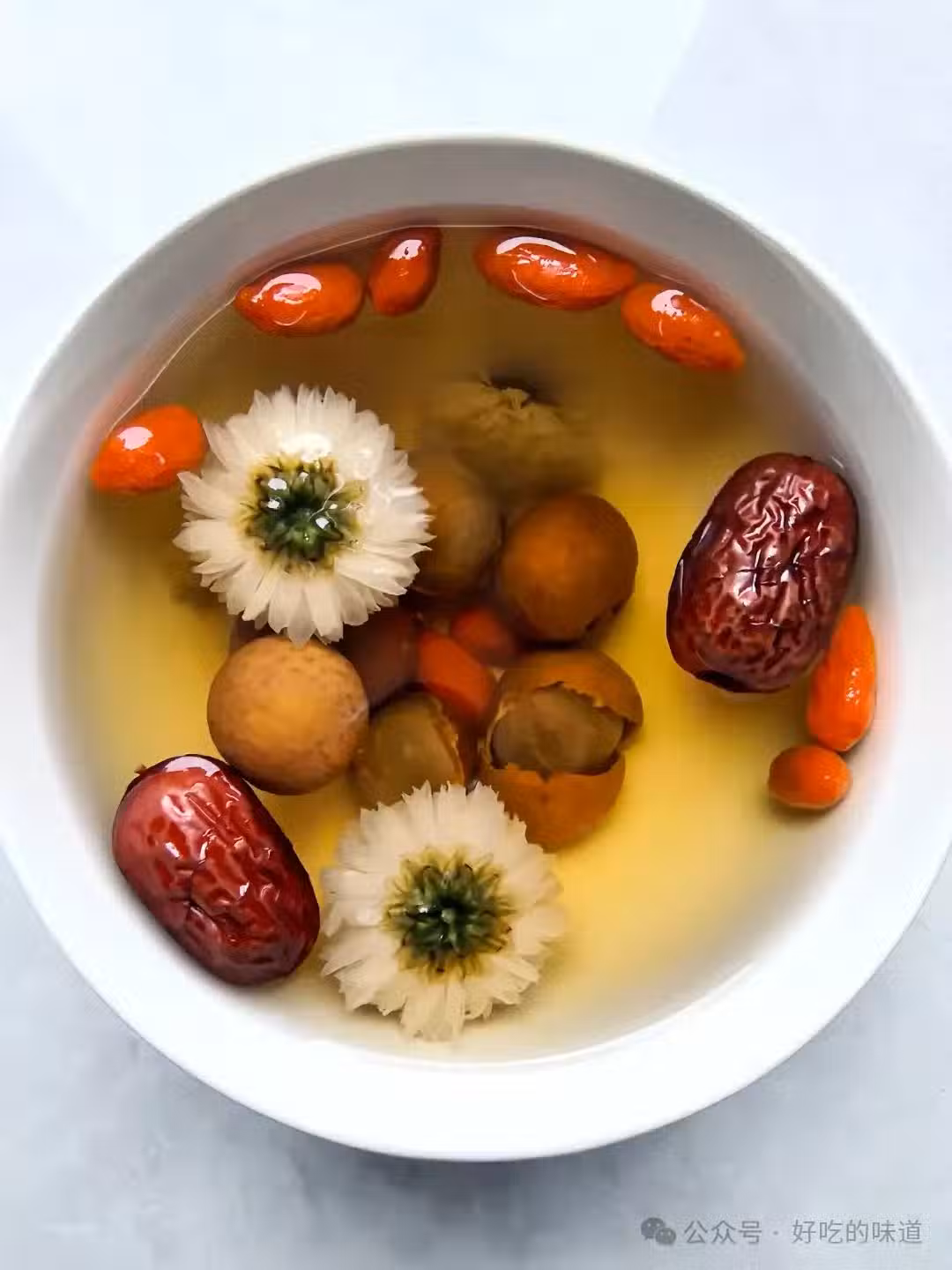 【食材準備】:帶殼桂圓乾6粒、紅棗4顆、枸杞5克、菊花3克
