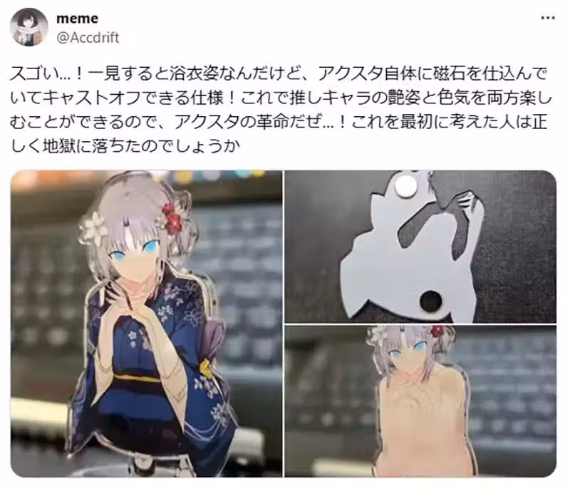 這位暱稱「meme」的日本X網友,最近發文稱讚起了手機遊戲,《忍者大師閃亂神樂NEW LINK》推出的一款壓克力人形立牌的設計實在太棒了!