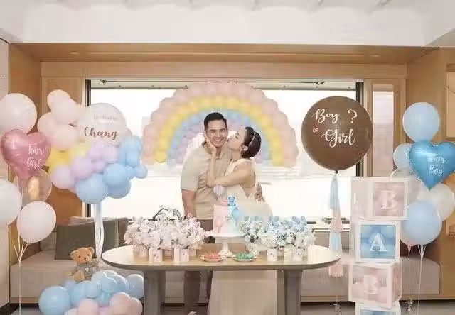 二人面前的桌子上除了擺滿鮮花和糖果,還有蛋糕,這滿滿的儀式感也是讓人為其點贊。雖然王君馨挺著八個月的孕肚,但是她的身材完全沒有走樣,四肢纖細,面部也沒有浮腫,看來私下也有專門做護理。