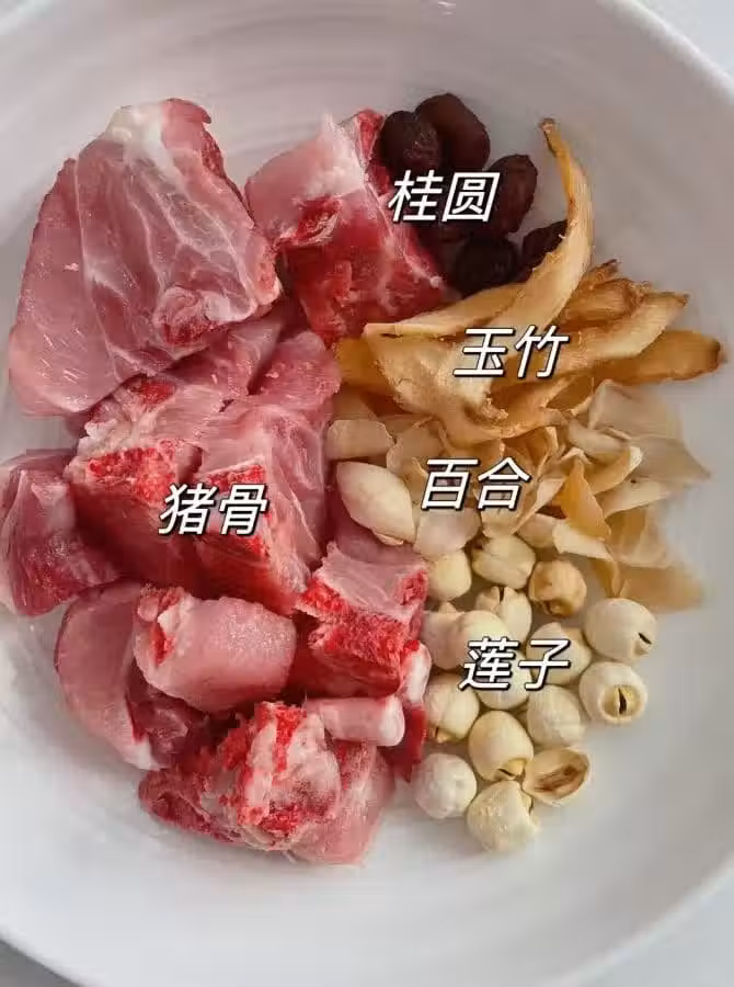 食材大集合🍲:精選豬骨(悄悄告訴你,想更直擊心靈?換成豬心試試,效果槓槓滴!)、溫潤如玉的蓮子、清新百合、甜蜜桂圓、還有滋陰潤燥的玉竹,每一味都是自然的小確幸~🌿