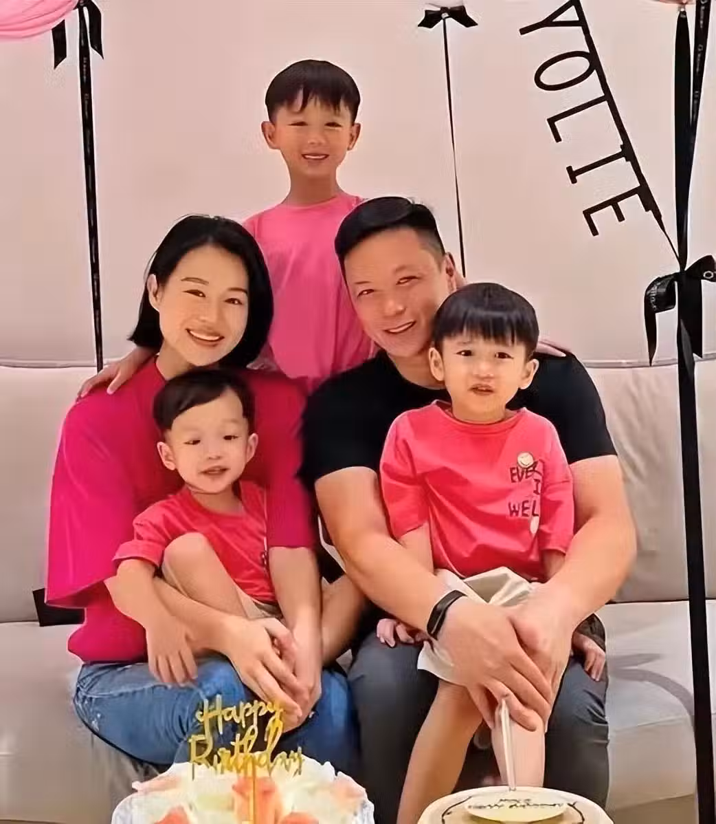 李乘德和胡杏兒生了三個兒子,每一個都特別活潑,大兒子站在父母身後,二兒子由李乘德抱著,小兒子坐在媽媽懷裡。