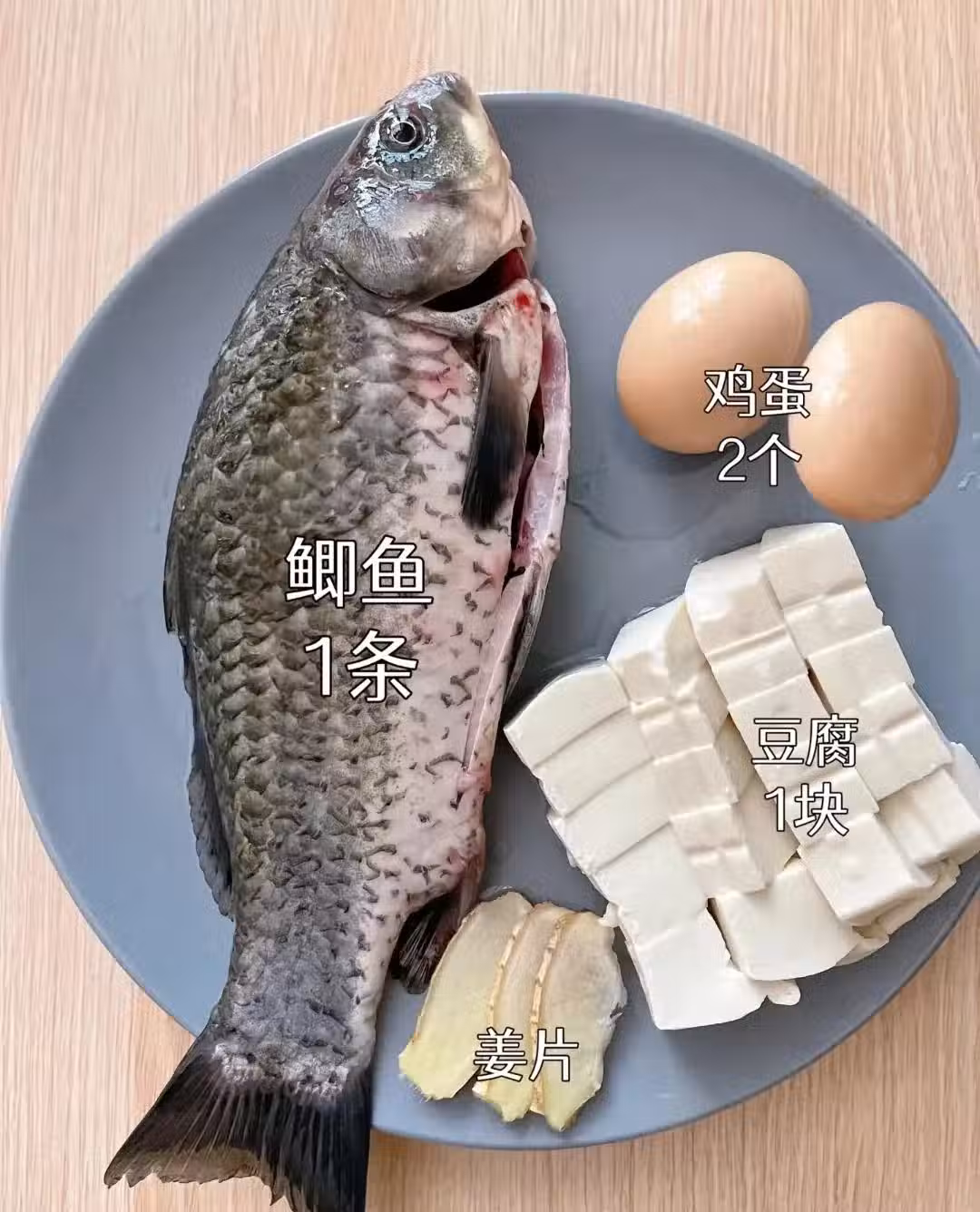 ❶鯽魚洗乾淨,豆腐切塊,姜切片,蔥切碎成蔥花,雞蛋先在鍋里放油煎熟盛出備用。