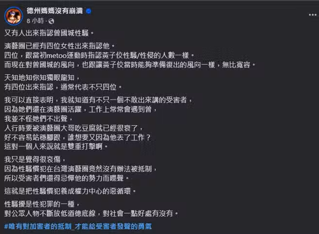 然而之前曾國城疑性騷女主持人的新聞出爐後,曾在《天才沖沖沖》擔任助理主持人的Albee范乙霏,遭影射為當事人。不過Albee已在IG否認:「沒有摸大腿這件事,沒有繼續主持只是因為當時與公司的合約已經結束了啦。」但德州媽媽認為,從以上資訊進行媒體識讀測驗,可能有三種情形:女星A不是Albee、Albee不敢承認、曾國城是清白的,「媒體識讀很考驗國民智慧。」