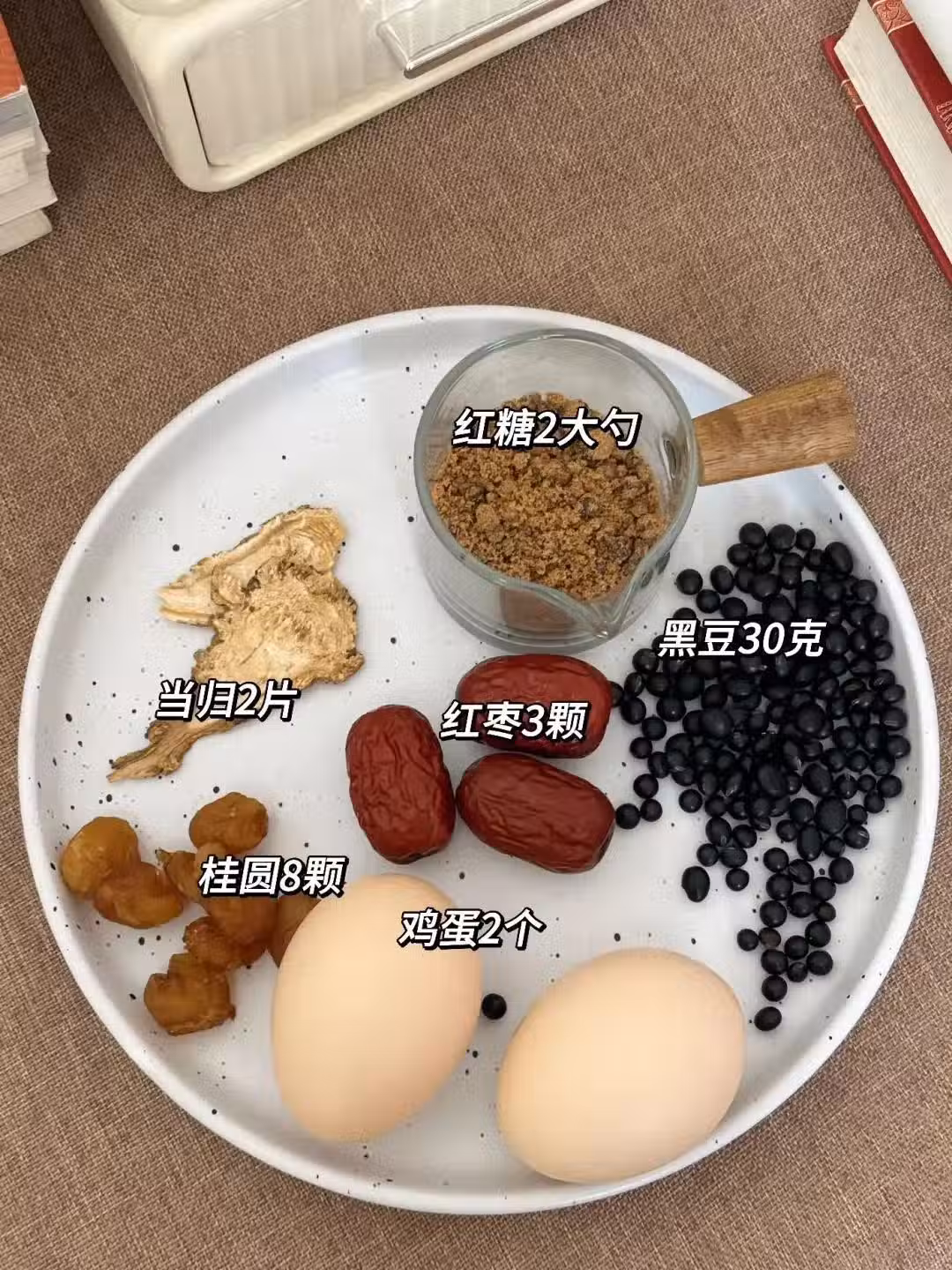 食材:當歸5克,雞蛋2個,黑豆30克,紅棗3顆,桂圓8顆,紅糖2大勺