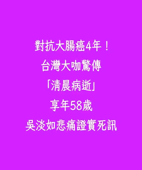 對抗大腸癌4年!台灣大咖驚傳「清晨病逝」享年58歲 吳淡如悲痛證實死訊.........
