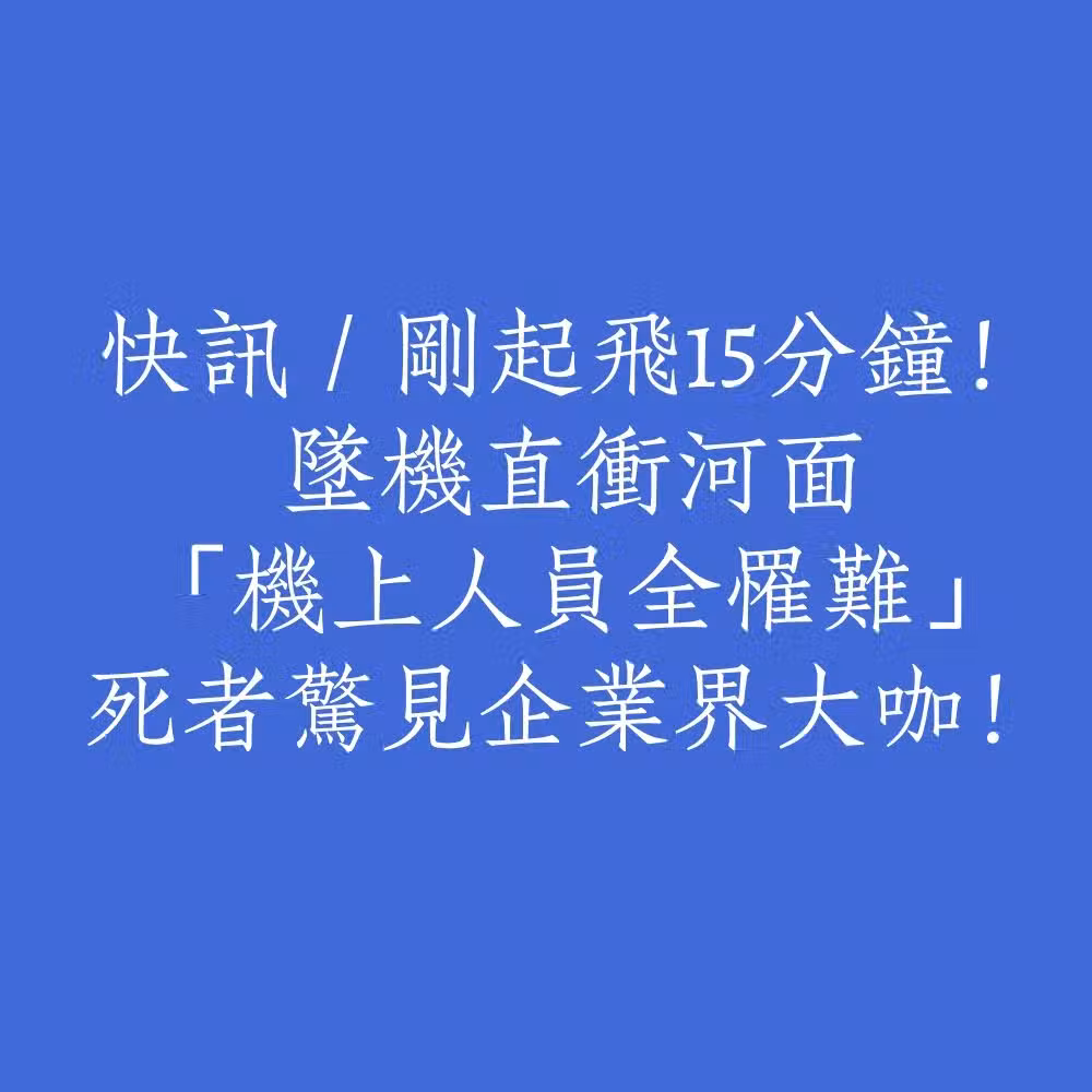 快訊/剛起飛15分鐘!墜機直衝河面「機上人員全罹難」...死者驚見企業界大咖!!