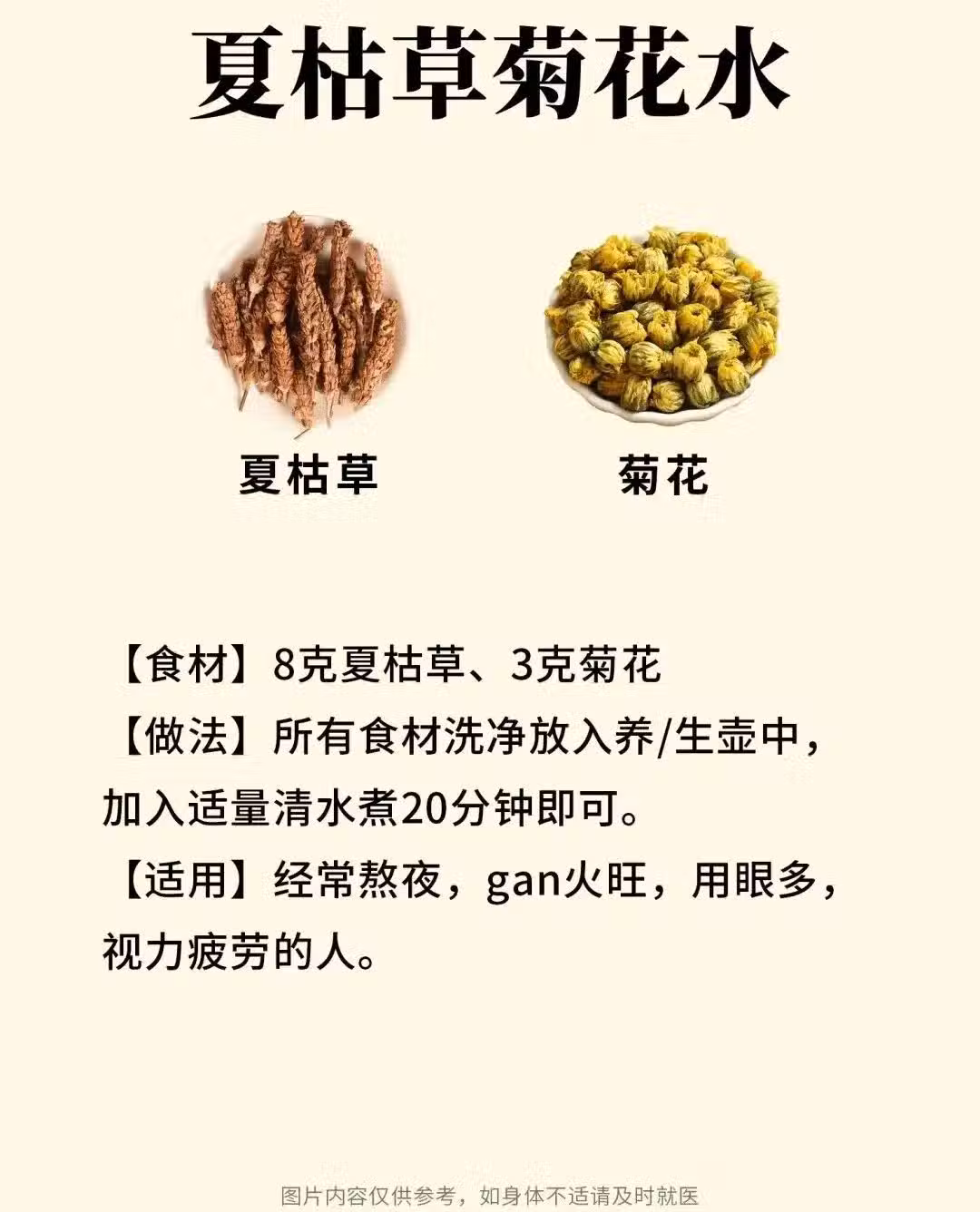 夏枯草麥冬水:夏枯草能清熱瀉火,麥冬能養陰生津,二者搭配使用能增強清熱效果,有明目的效果、也可以散結消腫:對於乳癰、肺癰、腸癰、瘰癧等症狀有一定的緩解,麥冬能潤肺清心,能緩解肺熱燥咳引起的咽喉腫痛、痰黃黏稠。