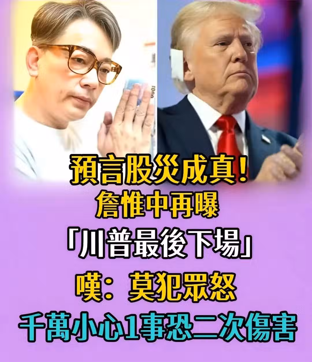 受到美國總統川普「全球對等關稅」政策震盪,台股也遭受波及、一片綠油油,許多投資人哀聲四起、紛紛慘賠。而知名命理師詹惟中、去年預言成真,引起大批網友熱烈議論!近日,他又大膽預測川普下場,並呼籲大眾不要受到「二次傷害」,話題一出...不少網友都相當認同。