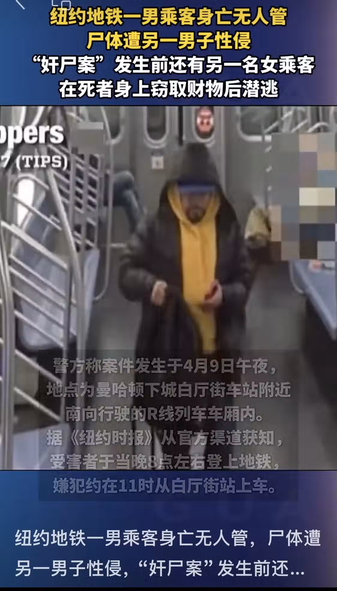 4月8日午夜,美國紐約地鐵發生離譜事件,一名流浪男子死在地鐵車廂里,之後一名男子當眾對其屍體進行性侵,警方正在對此人進行通緝。