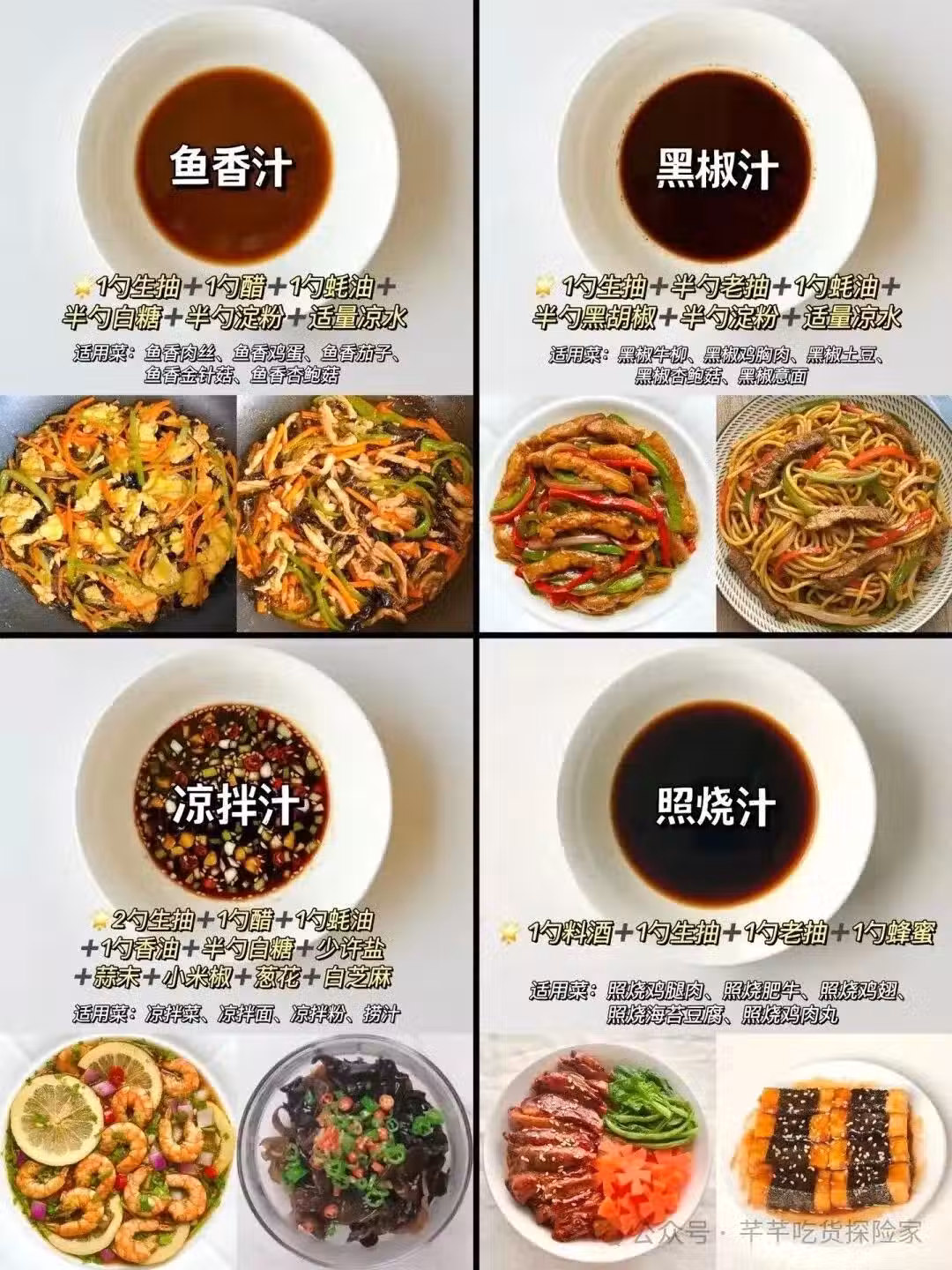 ✅糖醋汁 準備需要用到的調料:番茄醬,生抽,醋,白糖,澱粉,清水。 ✅宮保汁 準備需要用到的調料:生抽,醋,蚝油,白糖,澱粉,清水。 ✅麻醬汁 準備需要用到的調料:生抽,醋,蚝油,辣椒粉,白糖,芝麻醬,小米辣, 蒜末,蔥花,香菜。 ✅火鍋醬 準備需要用到的調料:生抽,醋,蚝油,白糖,辣椒油,香油,花生醬,小米辣,蒜末,蔥花,香菜。