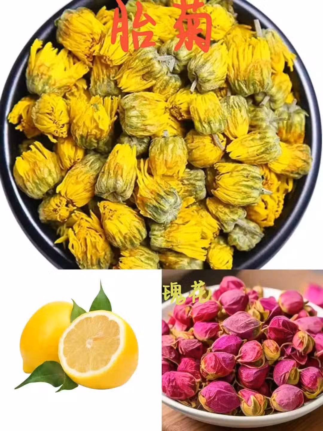 5️⃣檸檬玫瑰菊花茶 食材: 玫瑰花3朵,檸檬片2片,胎菊3朵 做法: 食材洗凈後,加入適量的水,養生壺煮開即可。 適用: 適合上班族用眼過度多,膚色暗沉發黃的人。