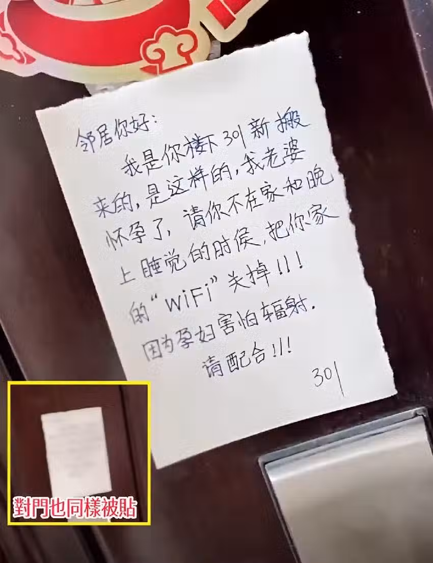 樓下新搬來的鄰居家因為有孕婦,貼了一張紙條,要求樓上晚上關掉WiFi,怕輻射對孕婦婦不好。