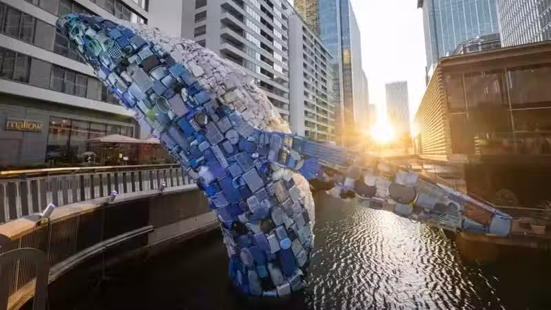 這隻鯨魚其實是一個環保藝術作品,全身上下都是由漂流在海洋中的塑膠垃圾組成,希望藉此提醒大家重視海洋環境的問題!