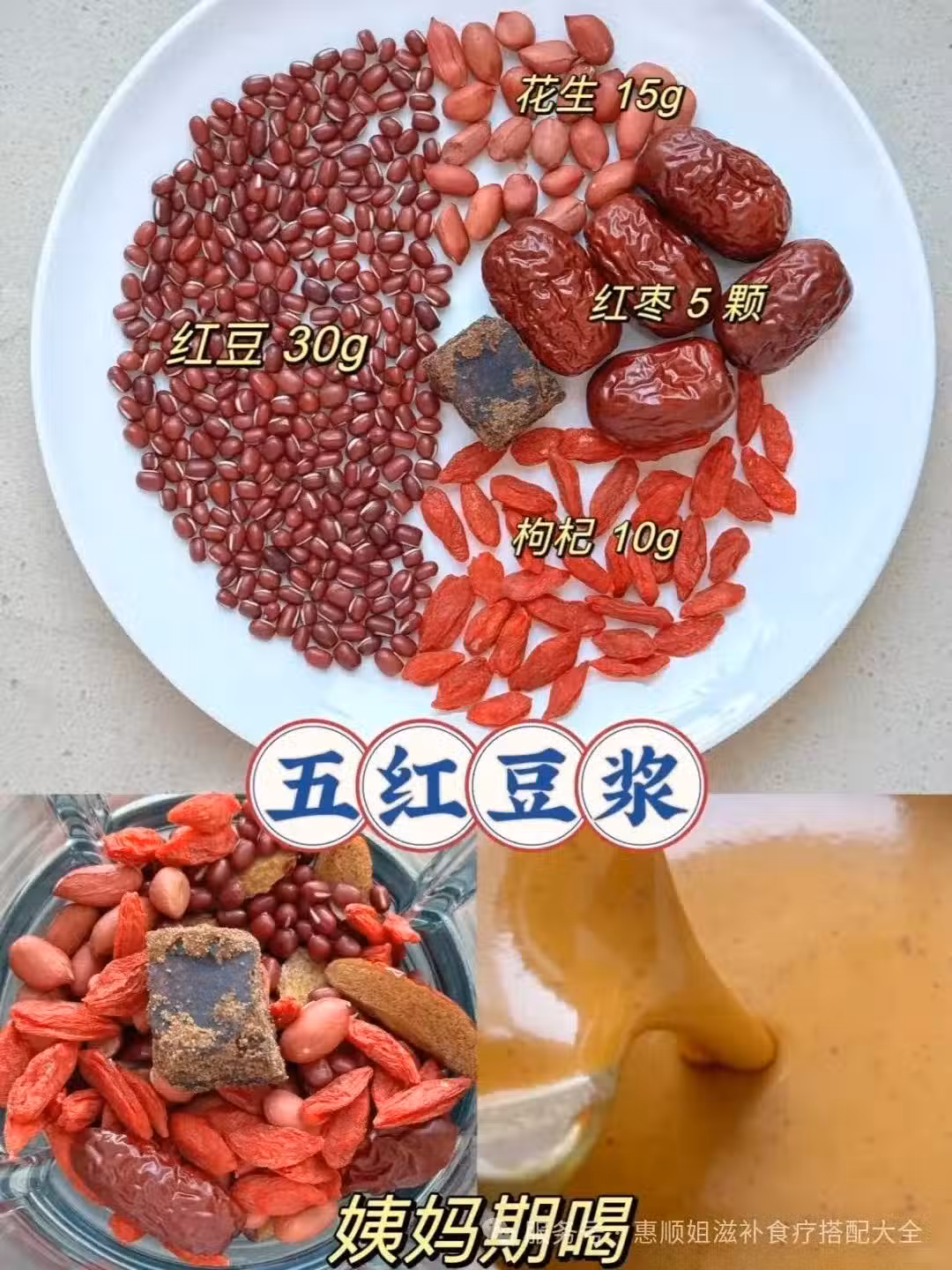 材料:紅豆 30g +花生 15g +百合 10g +枸杞 5g+紅棗 3 顆+水(破壁機水位600ml)