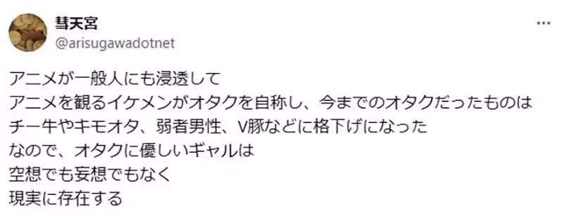 「我也一直這麼覺得耶。所謂『宅宅』變得被接受,並不代表不噁心了,只是換了個名稱而已。噁宅之所以讓人反感,不是因為他喜歡看動畫,而是因為他的言行舉止。像是社交能力低落、講話方式奇怪之類的。在公眾場合不懂分寸的那些行為,才讓人覺得噁心啊……」