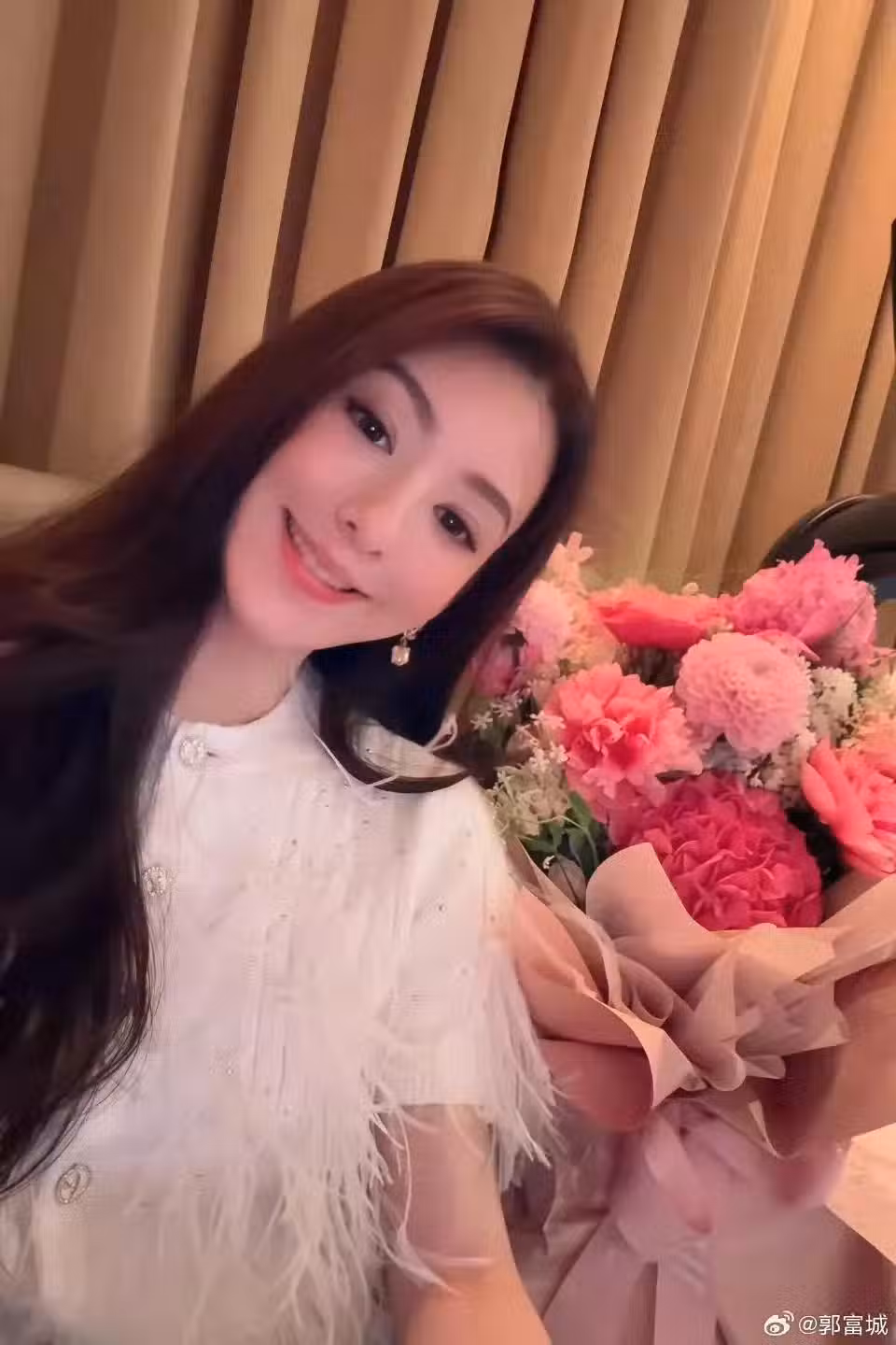 方媛開心跟鮮花合影,笑容看起來好幸福,加上顏值漂亮,簡直人比花嬌。方媛側著身子跟鮮花合影,還露出一個漂亮的鑽石耳環,不知是不是老公郭富城送的紀念日禮物呢。畢竟以前郭富城就說過,喜歡在節日送老婆珠寶首飾。