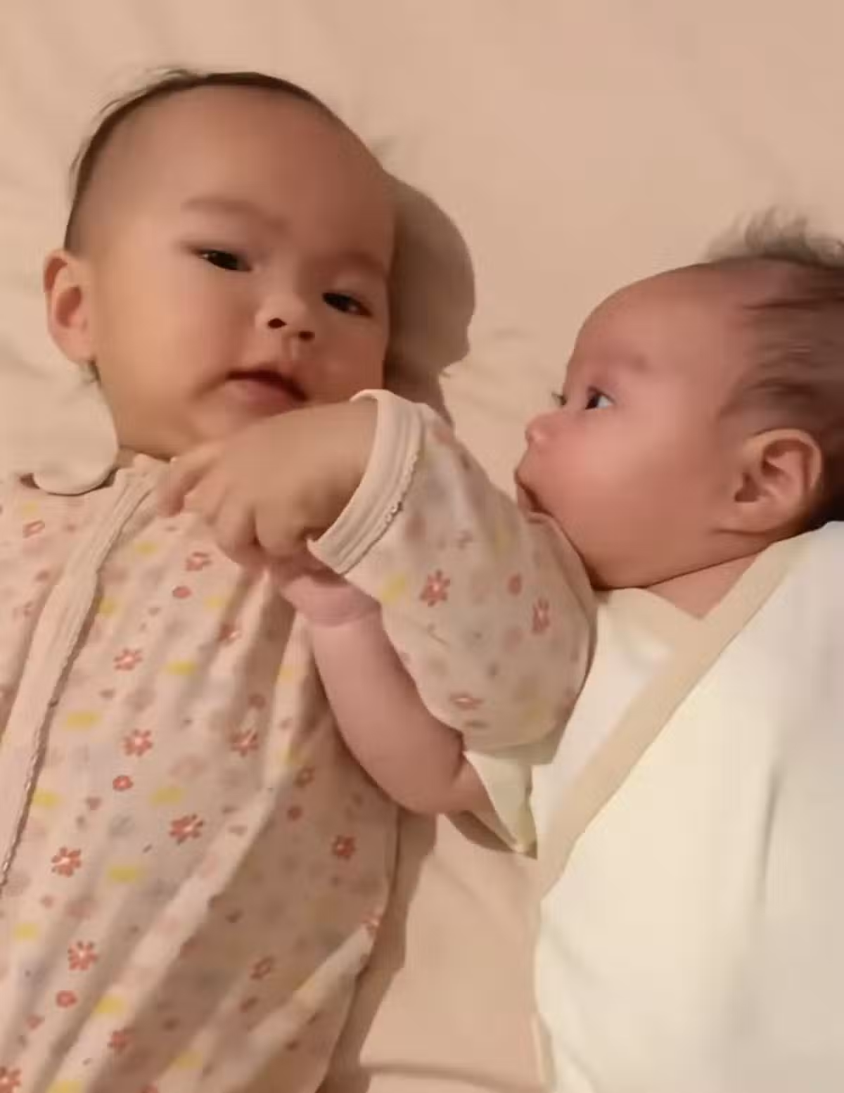而一旁剛出生兩個月的兒子則是依舊很小巧,他眼睛又大又圓,手腳看起來胖嘟嘟的,全程都表現的很活躍,相信將來也是個開朗的小傢伙。