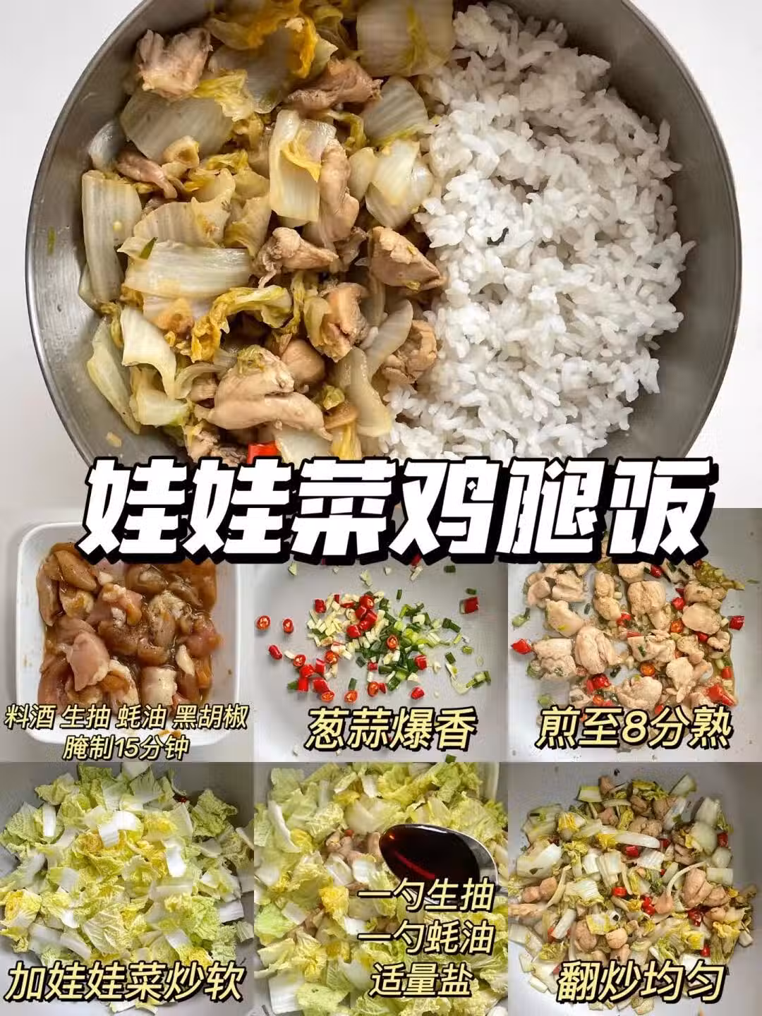 準備食材:娃娃菜、雞腿、小米辣、蒜末、蔥花 配料:生抽、蚝油、料酒、黑胡椒、食鹽 做法步驟:雞腿切成片後,加入料酒、生抽、蚝油、黑胡椒粉腌制15分鐘;油熱下辣椒和蒜末、蔥花爆香,倒入雞腿肉煎至八成熟,加入娃娃菜炒軟,加一勺生抽、一勺蚝油和適量食鹽,翻炒均勻即可盛出。