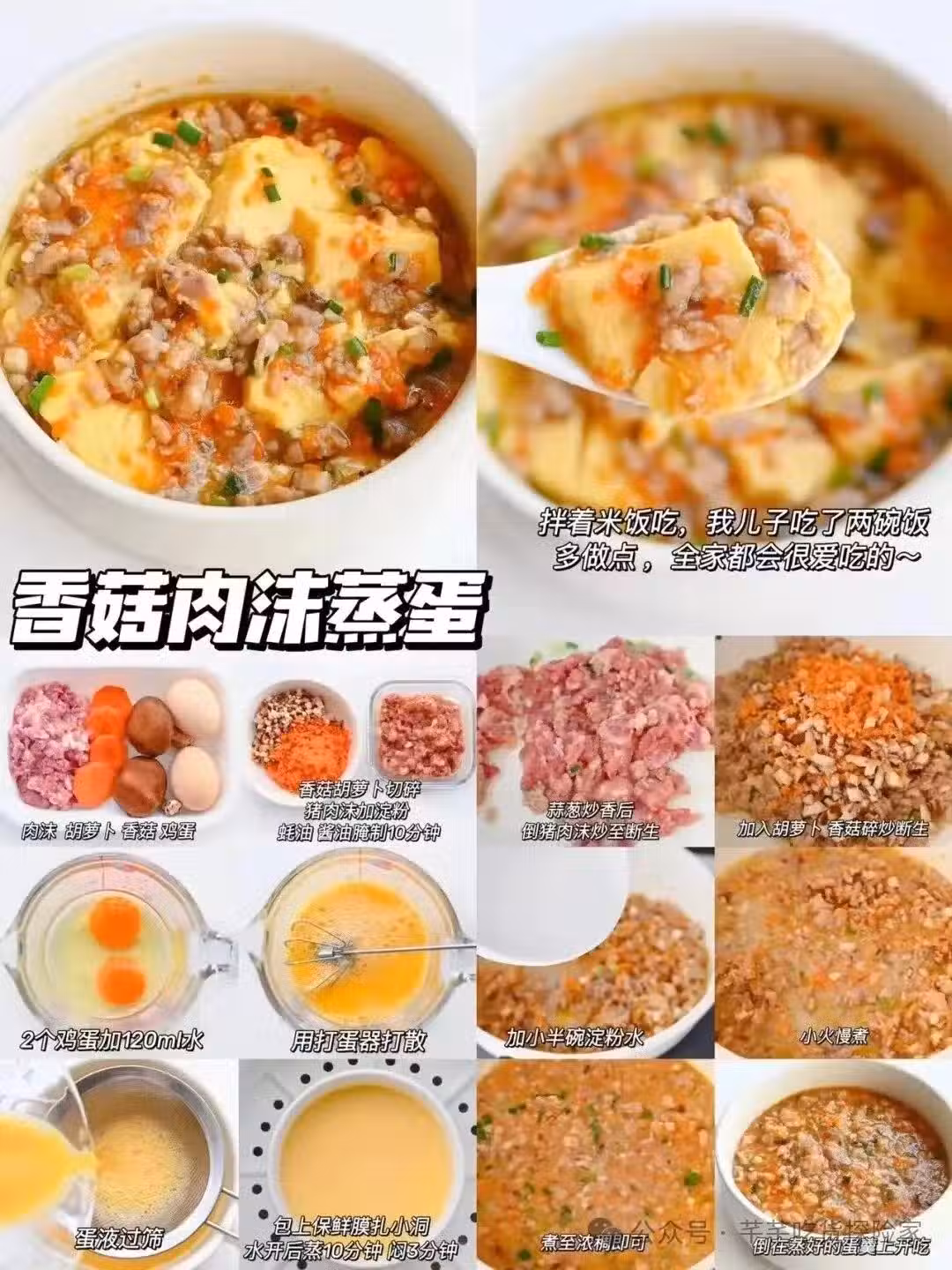 準備食材:肉末,雞蛋,香菇,胡蘿蔔,蔥花,醬油,蚝油,澱粉,鹽。