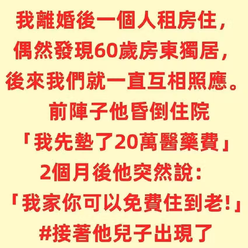 我離婚後一個人租房住,偶然發現60歲房東獨居,後來我們就一直互相照應。 前陣子他昏倒住院「我先墊了20萬醫藥費」,2個月後他突然說:「我家你可以免費住到老!」#接著他兒子出現了