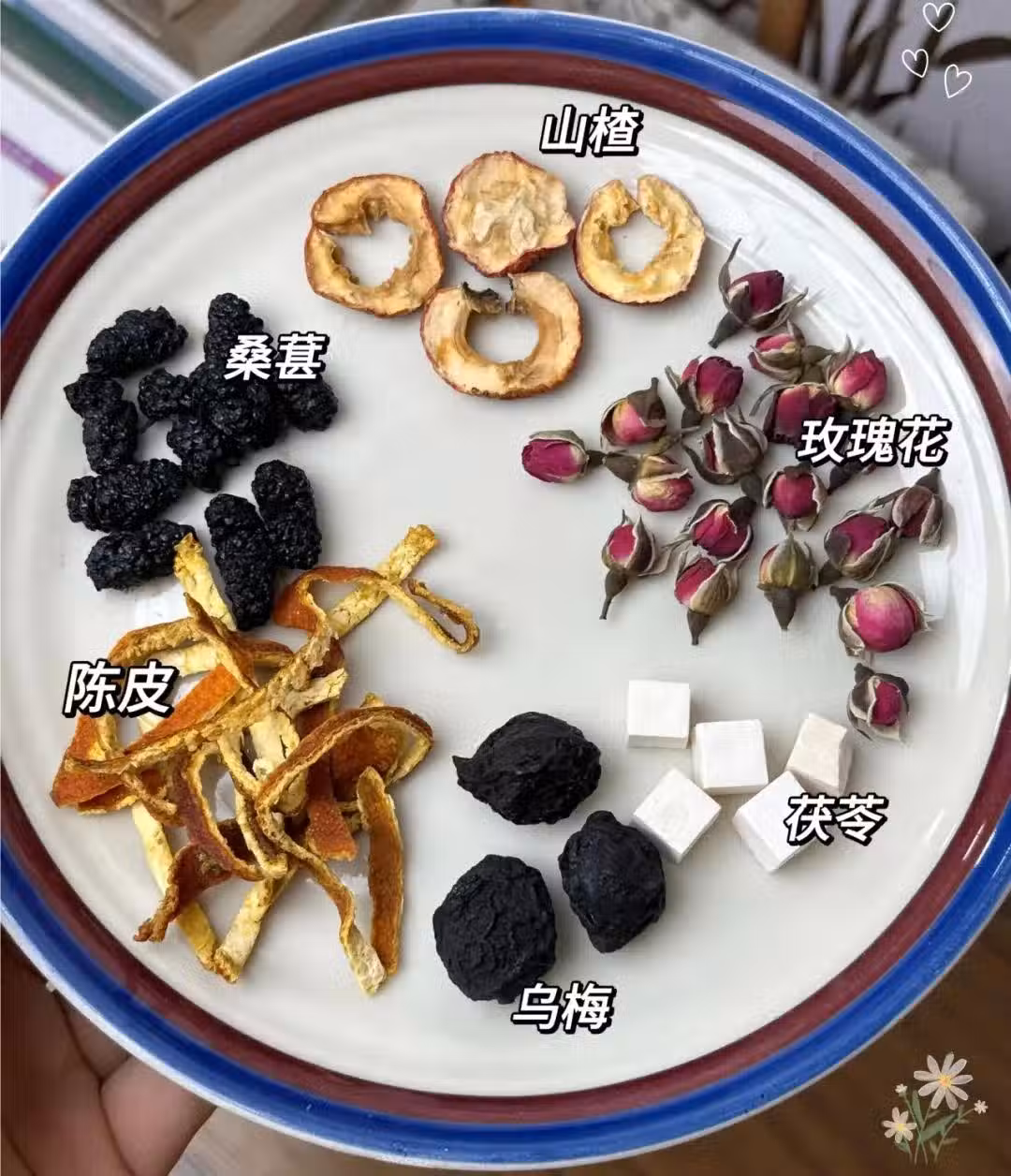 桑葚10顆,玫瑰6朵,茯苓5顆,陳皮3克,山楂4片,烏梅3顆