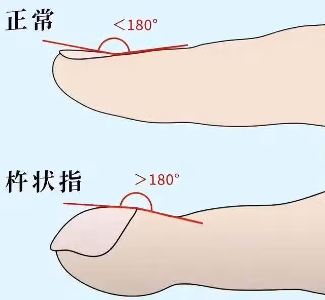 當肺部出現病變,氣道被堵住,身體組織得不到足夠氧氣,離心臟比較遠的手指末端,就可能出現周圍組織增厚的情況,這就是醫學上說的 「杵狀指」。