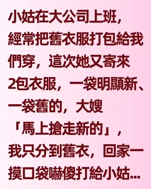 小姑在大公司上班,經常把舊衣服打包給我們穿,這次她又寄來2包衣服,一袋明顯新、一袋舊的,大嫂「馬上搶走新的」,我只分到舊衣,回家一摸口袋嚇傻打給小姑……