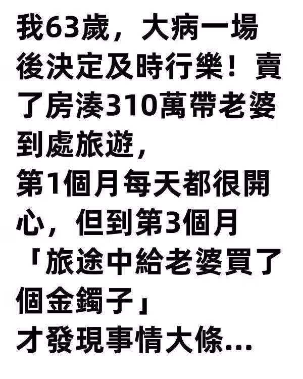 我63歲,大病一場後決定及時行樂!賣了房湊310萬帶老婆到處旅遊,第1個月每天都很開心,但到第3個月「旅途中給老婆買了個金鐲子…」才發現事情大條 !