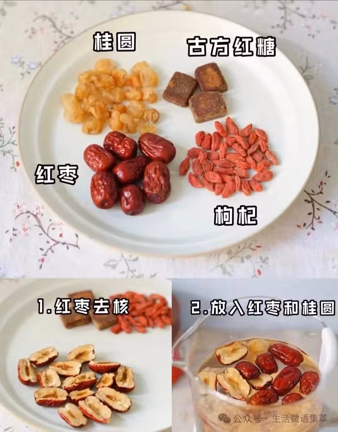 準備紅棗、桂圓乾、枸杞、紅糖作為食材。然後將紅棗、桂圓乾、枸杞用清水沖洗乾淨,紅棗要去核。