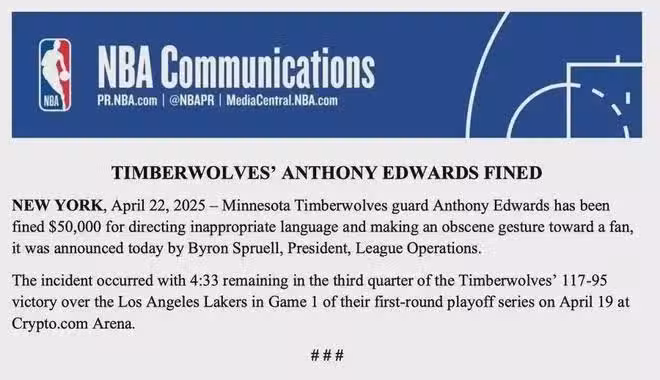 宣布了!NBA重罰愛德華茲...