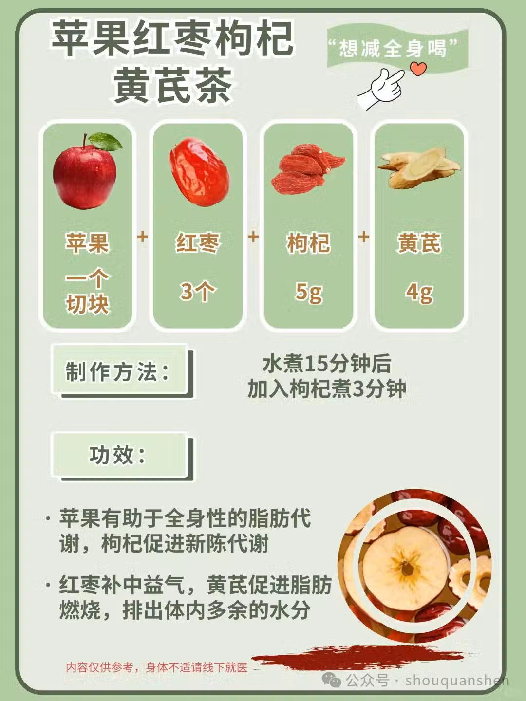 🍏 蘋果 + 紅棗 + 枸杞 + 黃芪:紅棗和枸杞補血養顏,黃芪增強免疫力,蘋果和枸杞幫助排毒。全身的脂肪都會被慢慢代謝掉,身材逐漸恢復苗條!
