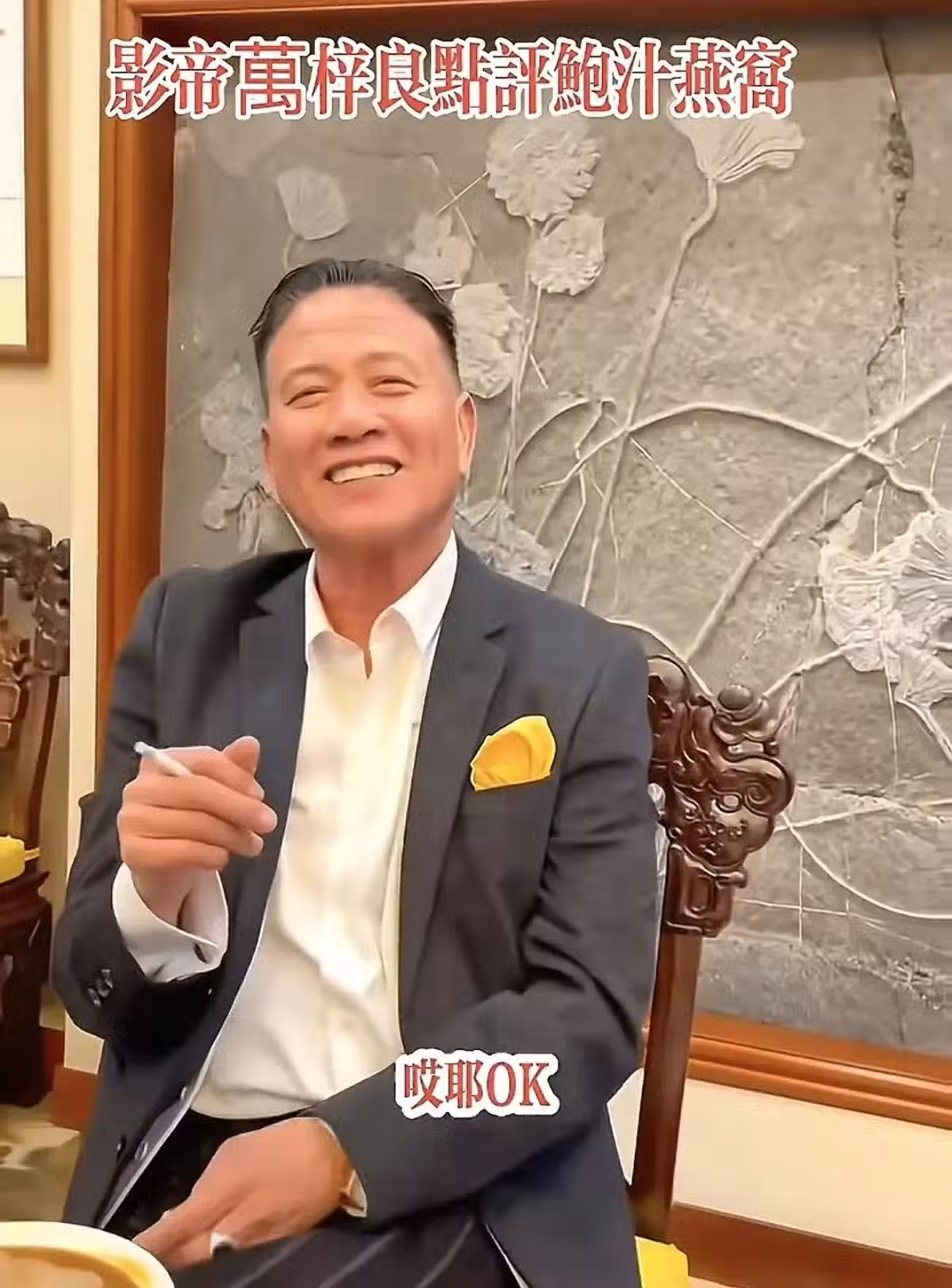 萬梓良中山品嘗燕窩,頭髮眉毛全白,疑戴假牙抽100元一包的香煙