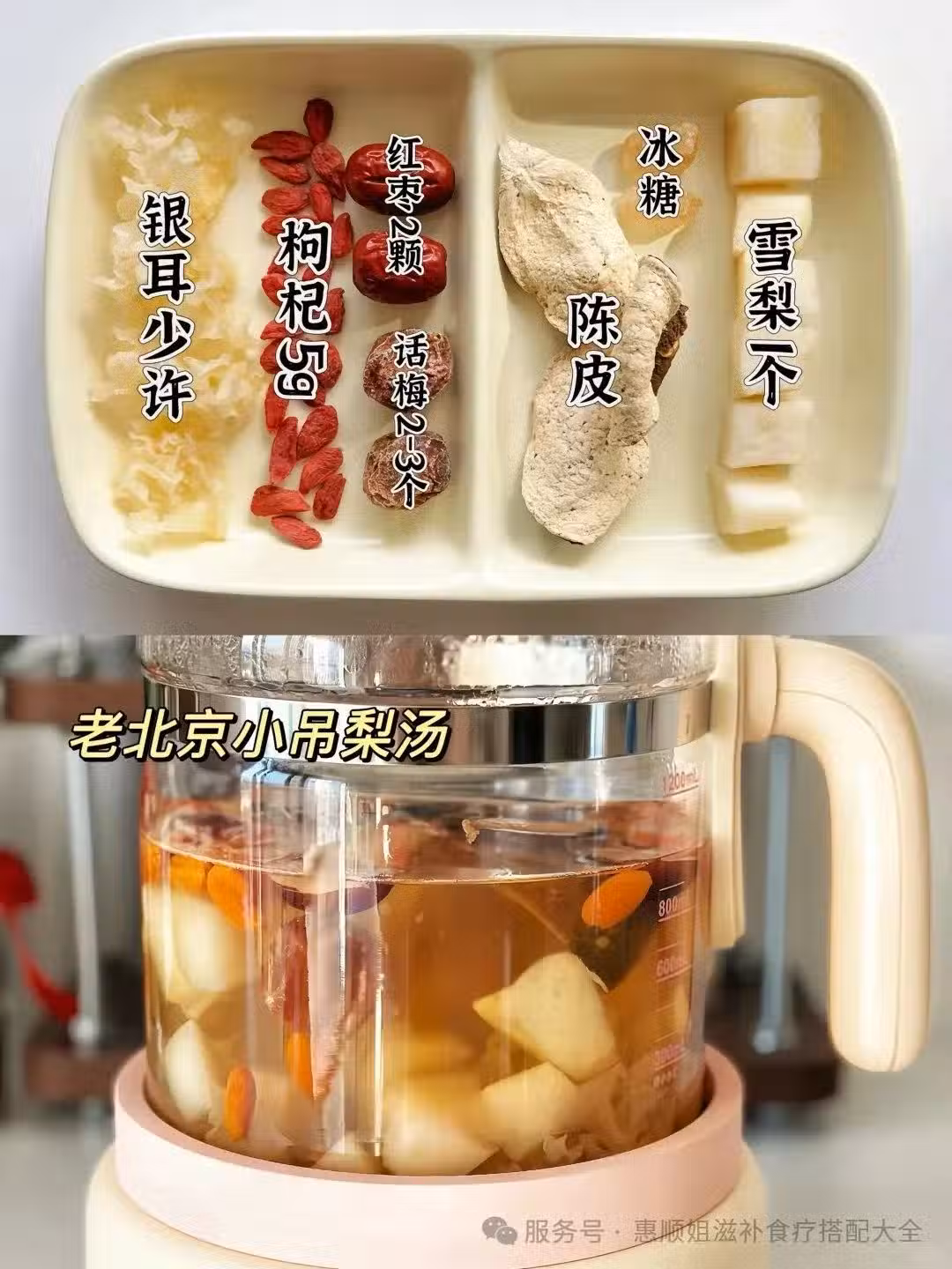 雪梨1個|銀耳|枸杞5g|去核紅棗2顆|話梅2-3個|陳皮|冰糖