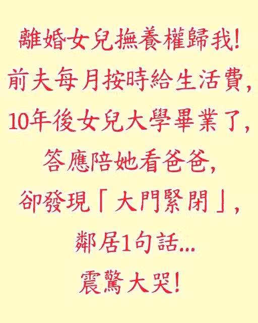 離婚女兒撫養權歸我!前夫每月按時給生活費,10年後女兒大學畢業了,答應陪她看爸爸...卻發現「大門緊閉」,鄰居1句話…震驚大哭