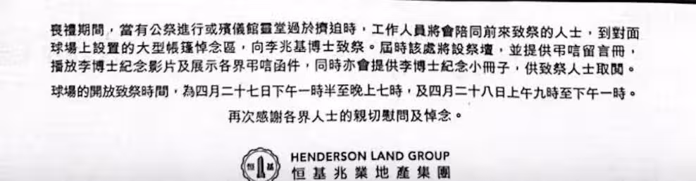 李兆基治喪委員會名單公布,全是香港富商政要,李嘉誠父子沒參與