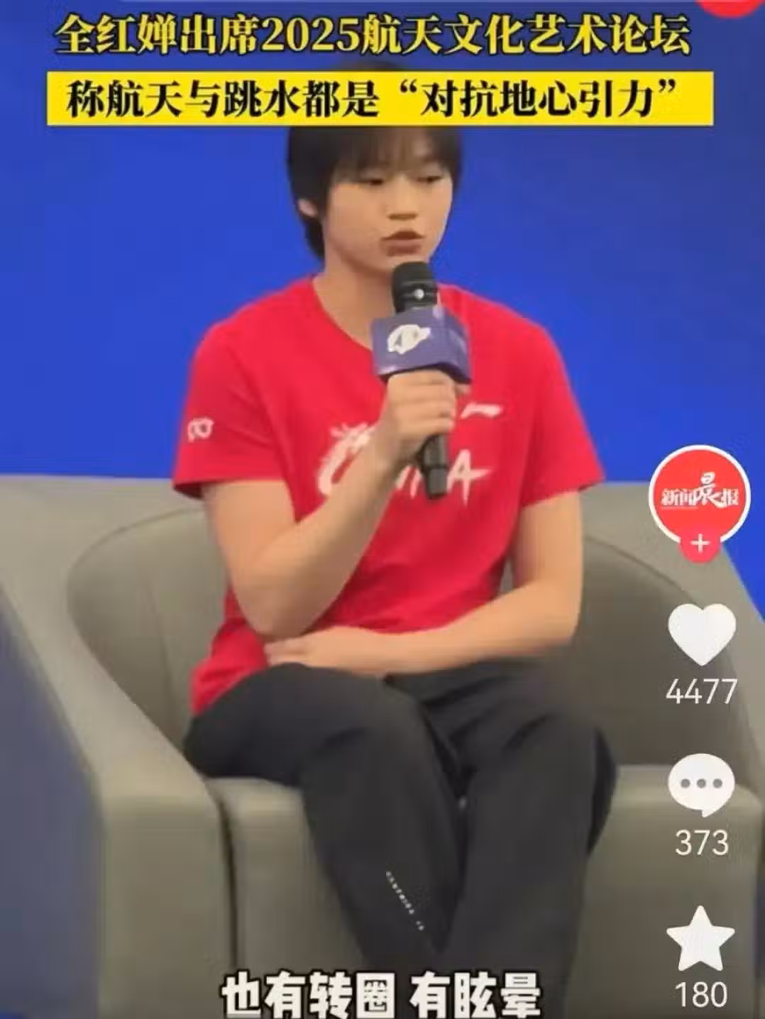 「跳水嘛,就是征服水;航天呢,就是征服天。其實咱們都一樣,都是跟地球引力對著干。訓練的時候啊,我們都會有轉圈兒、暈乎乎的那種感覺。」