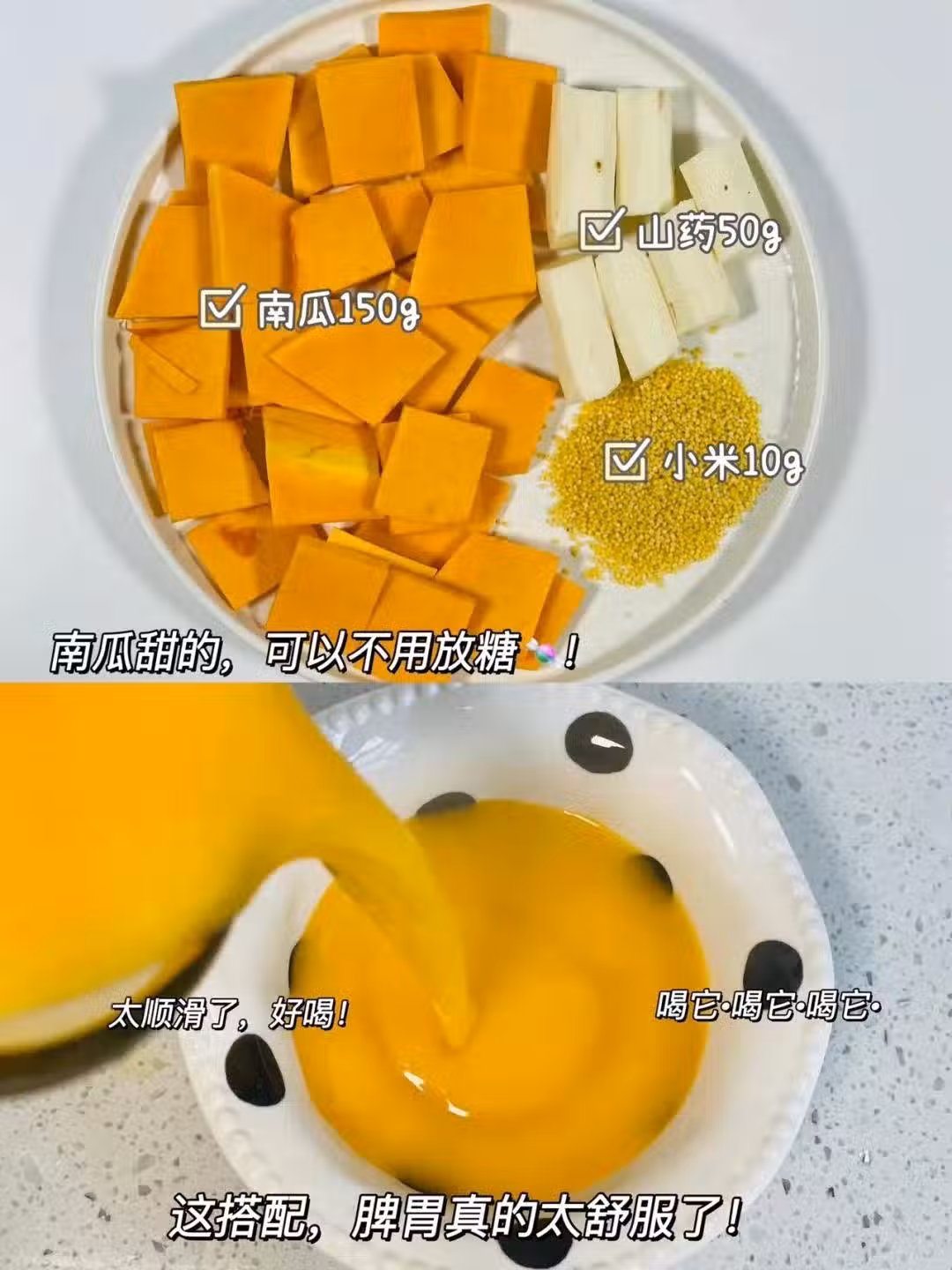 山藥和小米都具有健脾養胃的功效,能夠緩解脾胃虛弱、消化不良等問題。南瓜也有助於保護胃黏膜,促進胃部健康。