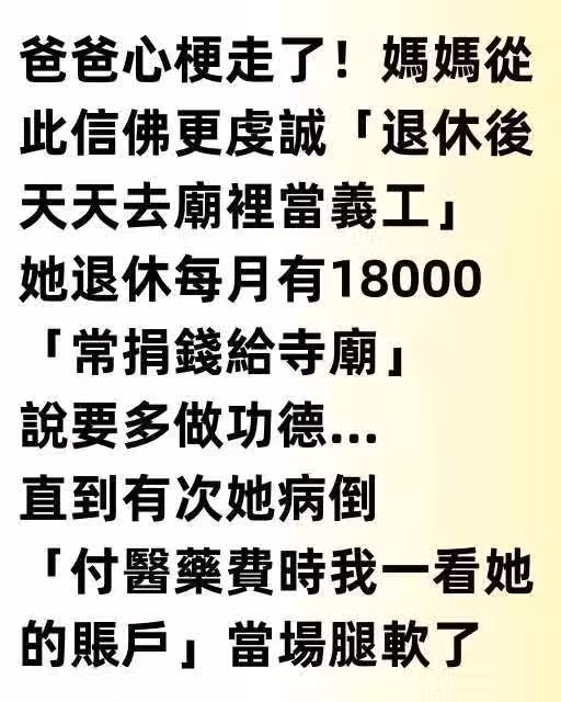 爸爸心梗走了!媽媽從此信佛更虔誠「退休後天天去廟裡當義工」,她退休每月有18000「常捐錢給寺廟」說要多做功德… 直到有次她病倒「付醫藥費時我一看她的帳戶...」當場腿軟了