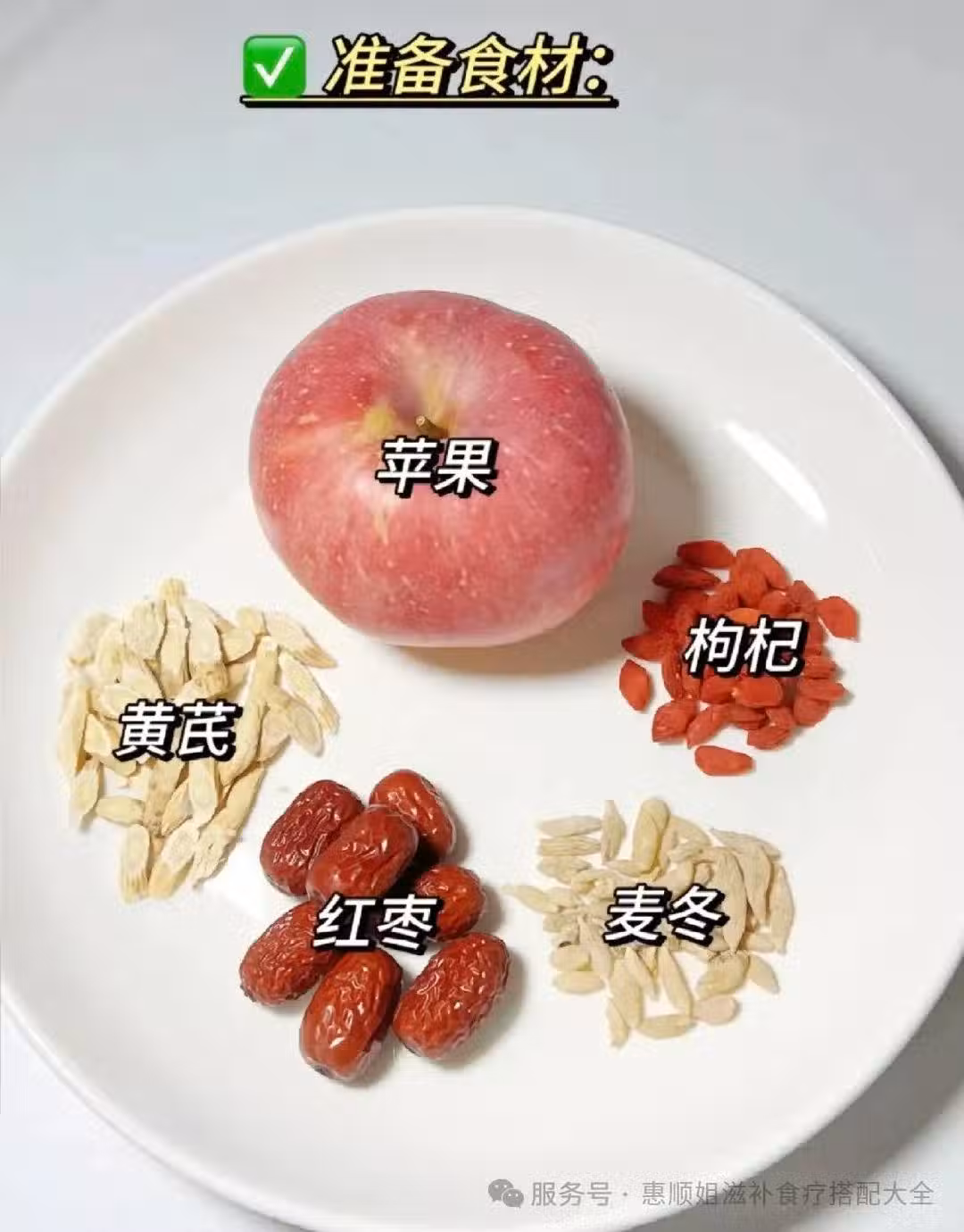 黃芪5g+蘋果1個+紅棗3顆+枸杞10粒+黃芪5顆 (蘋果帶皮切塊更營養哦)